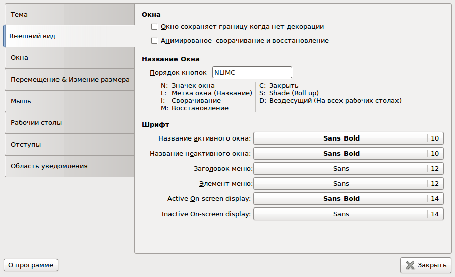 Вернёмся к obconf. На вкладке “Внешний вид” настраиваются шрифты и набор управляющих кнопок в заголовке окна.