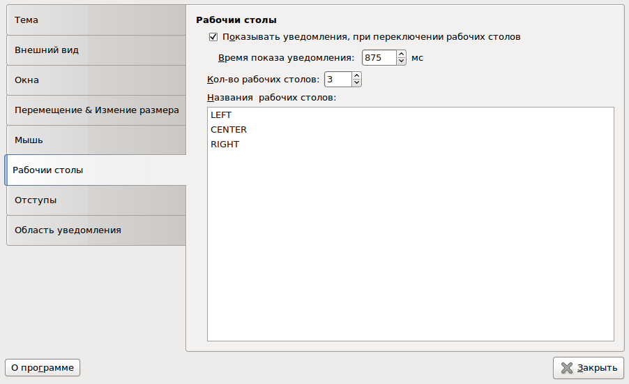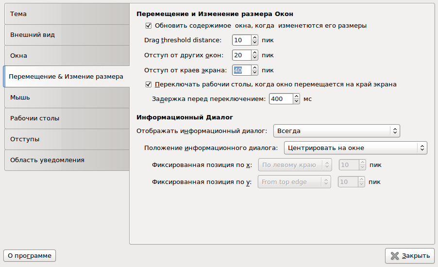 Окно может автоматически переместиться на другой рабочий стол, если во время перемещения какое-то время подержать его у края экрана. Задержка указывается в милисекундах. Мне нравится когда подобные вещи можно указать с высокой точностью. В Windows и, уж тем более Android, у вас в лучшем случае будет выбор из трёх значений: быстро, средне, медленно.