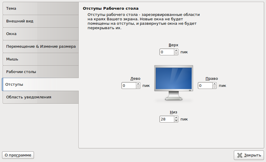 Отступ нам понадобится для панели, в моём случае это tint2.
