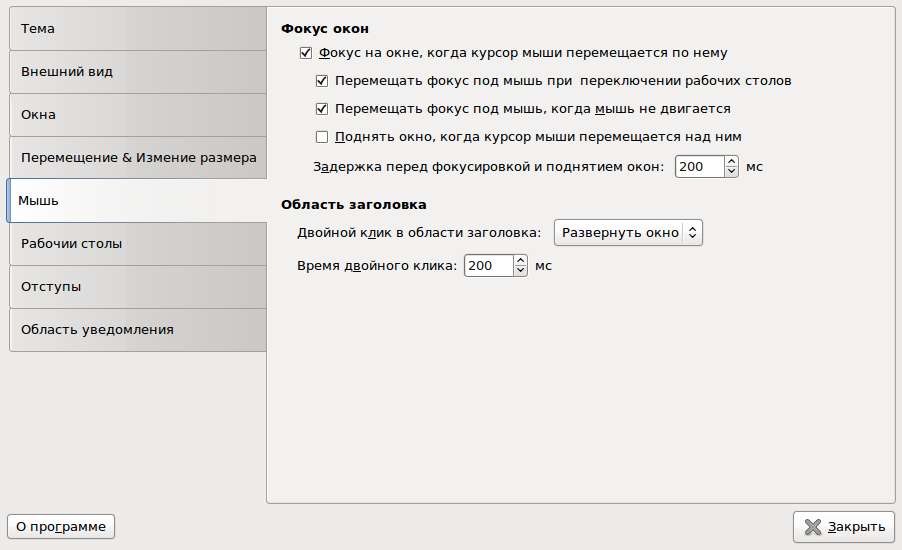 Фокус на окне, когда курсор мыши перемещается по нему (Focus windows when the mouse pointer moves over them) — очень приятная опция, рекомендую включить. Особенно если вы часто работаете в нескольких окнах, расположенных рядом. С этой опцией окно становится активным, если переместить указатель мыши в его зону. С выключенной опцией надо ещё и кликнуть. Казалось бы, смешная экономия в один клик… Но без него переключение на другое окно проходит плавнее и быстрее.