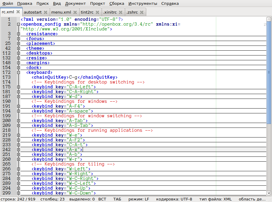 Для правки конфига я рекомендую редактор Geany. Потому что там есть подсветка синтаксиса и классный фолдинг (Документ → свернуть все). Далее нам надо раскрыть секцию <keyboard> .
