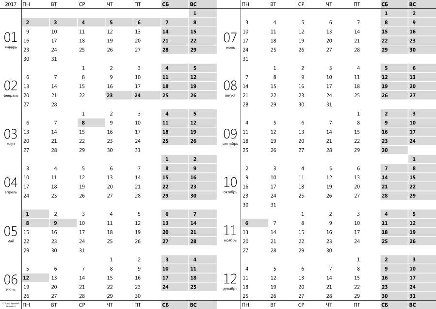 Распечатанный календарь вешается на видном месте, все важные даты подписываются (для этого отведено место справа от даты).